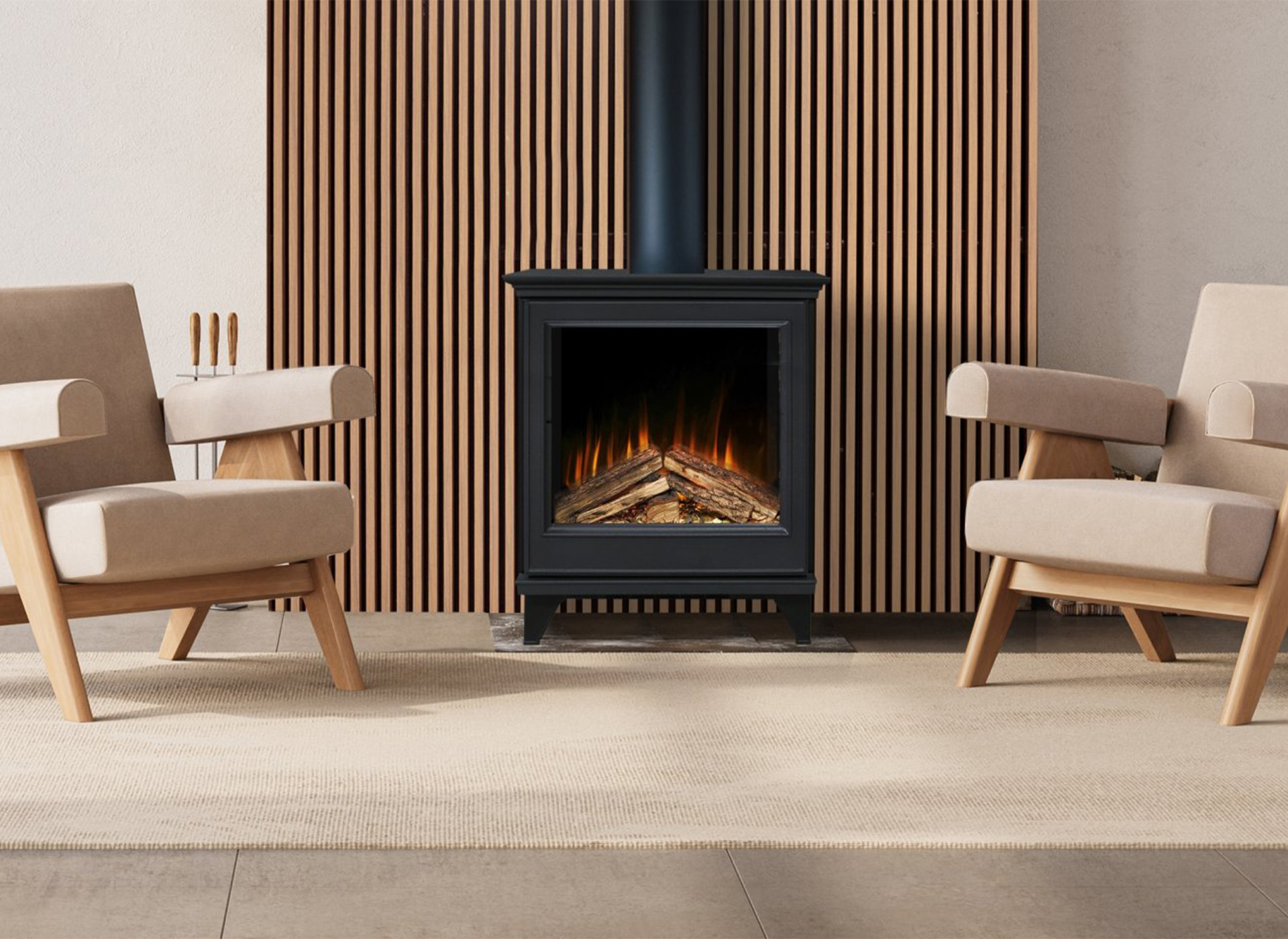 De antraciet gietijzeren kachel straalt degelijkheid en elegantie uit, terwijl de zwarte achterwand zorgt voor extra diepte in het vlameffect. De vaste Veluwse houtset voegt een authentieke uitstraling toe, alsof u geniet van een echt knisperend haardvuur, maar dan zonder rook of onderhoud.